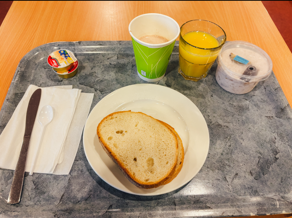 Le temps de prendre une bonne douche (tout est relatif, la pression est tellement faible qu’il fait 5 minutes juste pour rincer le gel douche) je m’habille est descend prendre mon petit déj’. À force, je commence à avoir ma routine à la cafet: services, verre, serviettes, assiette, tranches de pain, bircher, miel, jus d’orange, chocolat chaud… et on engloutit tout ça dans l’ordre habituel: tartines de miel, bircher, jus d’orange, chocolat chaud.