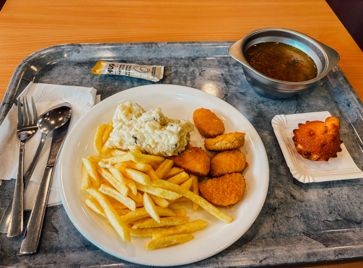 Arrive l’heure de descendre. Comme à chaque fois, je vérifie 15x les horaires des repas avant de descendre et je m’assure de connaître les grandes lignes du repas par coeur pour ne rien oublier. Une fois mon repas servis, je m’installe à une table isolée et - si possible - d’où je peux surveiller toute la salle. C’est le Spartan (ou le gamer) qui est en moi qui me fait agir de la sorte.